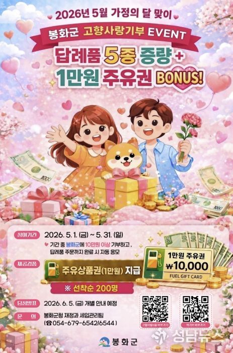 봉화군은 5월 가정의 달을 맞이하여 고향사랑기부제 활성화를 위해 5월 1일부터 31일까지 1개월간 “답례품 UP ! 주유권 BONUS !”란 주제로 고향사랑기부제 경품 이벤트를 진행한다.