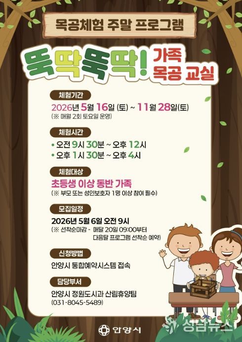 안양시는 초등학생과 가족이 함께 참여할 수 있는 목공체험 주말 프로그램인 ‘뚝딱뚝딱! 가족 목공 교실’을 운영한다고 30일 밝혔다.