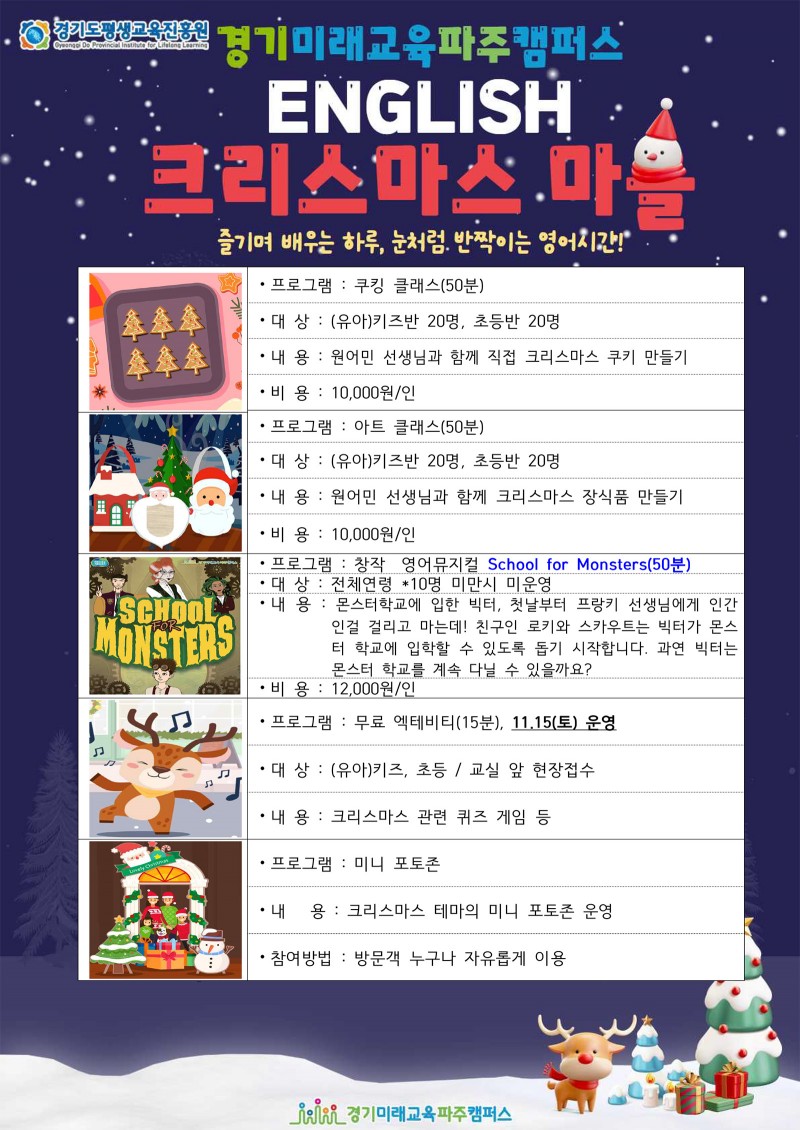 경기도평생교육진흥원 경기미래교육파주캠퍼스(구 파주영어마을)가 다가오는 크리스마스를 맞아 어린이들의 글로벌 감각을 키울 수 있는 특별 영어체험 프로그램을 운영한다.