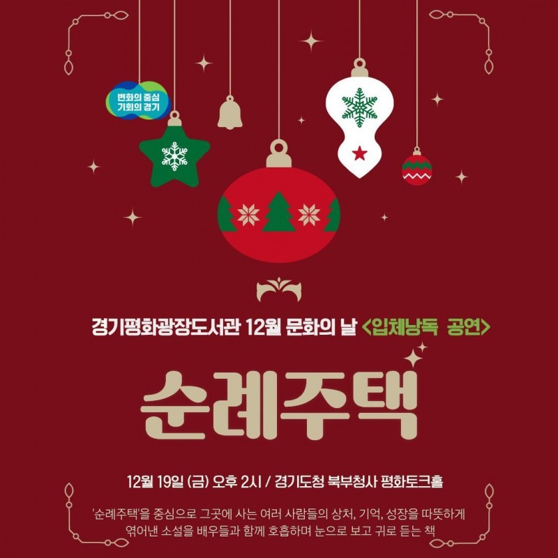 경기도는 12월 19일과 20일 이틀간 도 북부청사 평화토크홀에서 ‘모두가 함께하는 겨울 감성 공연-함께 읽고, 함께 웃는 하루’를 주제로 경기평화광장도서관 12월 문화의 날 행사를 연다.