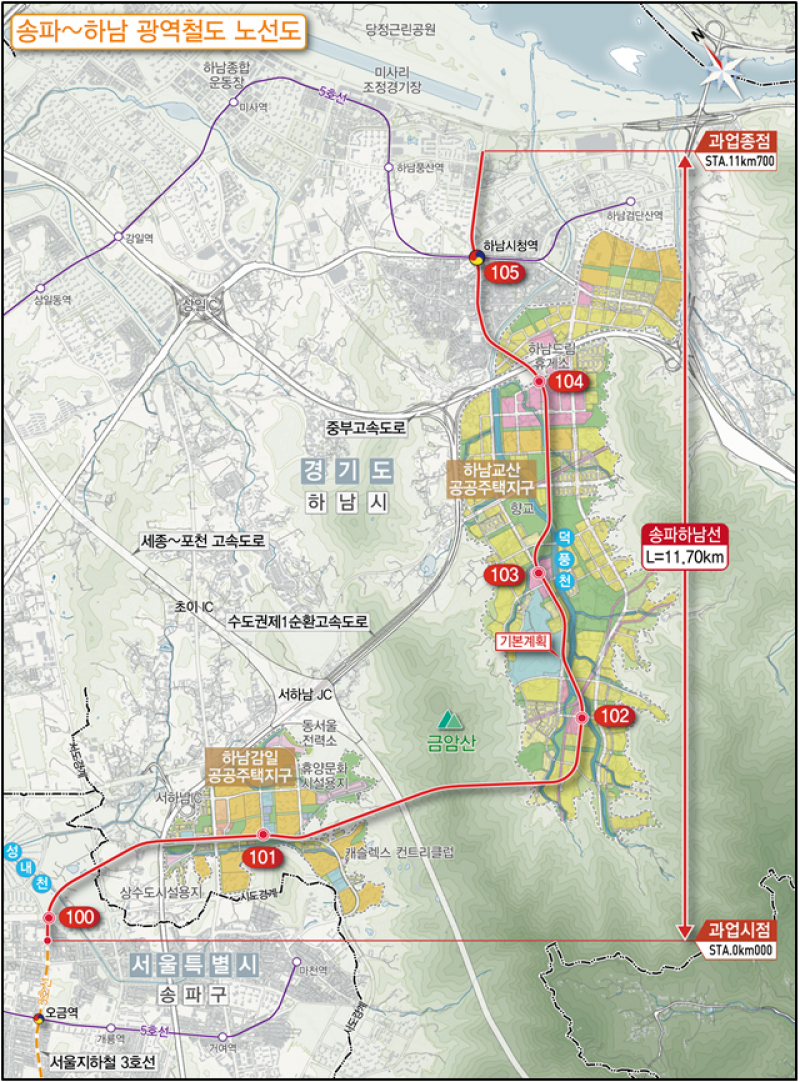 송파하남선 광역철도 건설사업은 서울지하철 3호선 오금역에서 하남시청역까지 총 연장 11.7km 구간을 연결하는 광역철도 건설사업이다. 기존 서울 도심과 하남 감일·교산 신도시를 경유하며 2027년 착공, 2032년 개통을 목표로 추진하고 있다.