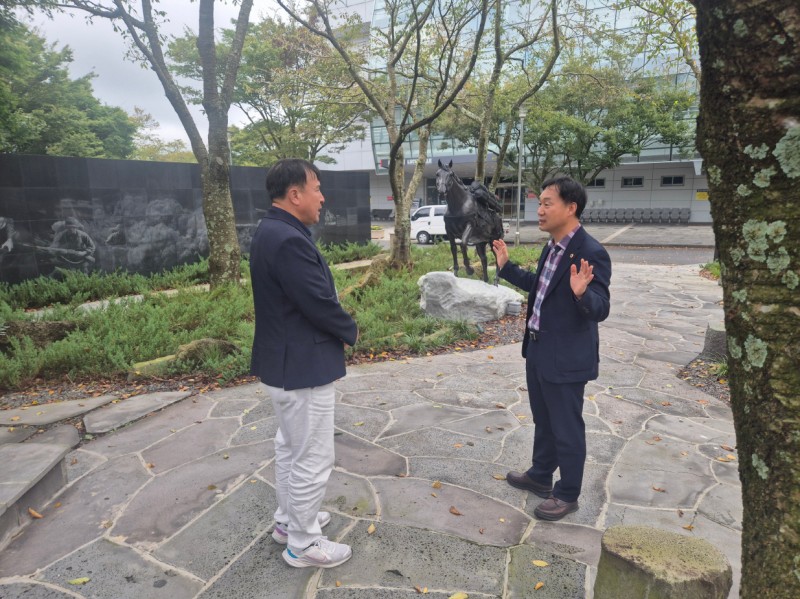 경기도의회 농정해양위원회 부위원장 윤종영 의원(국민의힘, 연천)은 10월 22일(수) 한국마사회 제주본부를 방문해 군마 ‘레클리스’ 기념행사의 의미를 공유하고, 경기도와 제주특별자치도, 한국마사회 간 협력 방안을 논의했다.