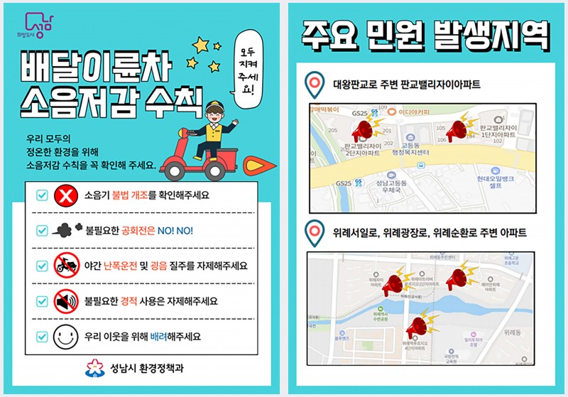 성남시(시장 신상진)는 이동 노동자(배달 라이더)들이 이용하는 이륜차(오토바이) 소음 줄이기에 나선다.