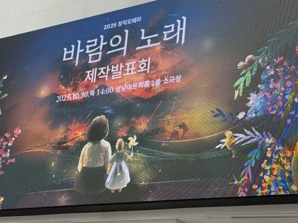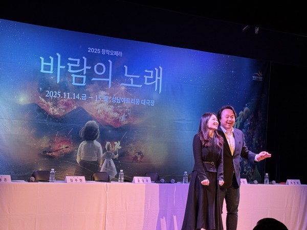 성남문화재단(대표이사 윤정국)이 10월 30일 성남아트리움 소극장에서 창작오페라 '바람의 노래'의 제작발표회를 개최했다. 이날 행사에는 윤정국 대표이사를 비롯해 황정은 작가, 김주원 작곡가, 조은비 연출가와 소프라노 홍혜란, 테너 최원휘 등 주요 제작진과 출연진이 참석해 작품의 의미와 무대를 미리 공개했다.
