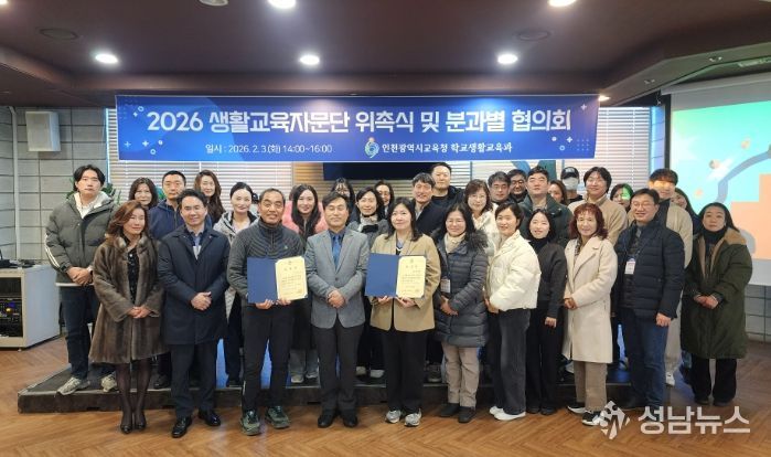 성남뉴스 관리자 기자 | 인천광역시교육청은 3일 샤펠드미앙에서 생활교육자문단 50명을 대상으로 ‘2026년 위촉식 및 분과별 협의회’를 개최했다.