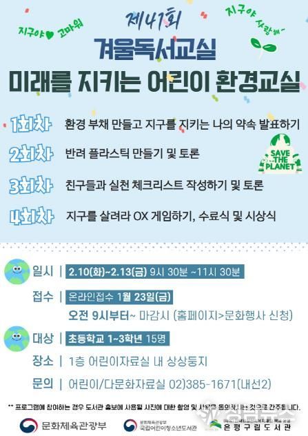 성남뉴스 관리자 기자 | 서울 은평구는 은평구립도서관에서 제41회 겨울독서교실 ‘미래를 지키는 어린이 환경교실’을 운영한다고 밝혔다.