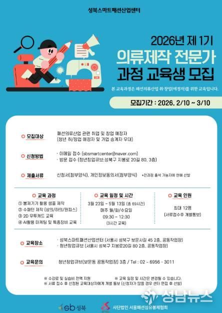 성남뉴스 관리자 기자 | 서울 성북구가 (사)서울패션섬유봉제협회에 위탁 운영 중인 성북스마트패션산업센터에서 2026년 제1기 의류제작 전문가과정 교육생을 모집한다.