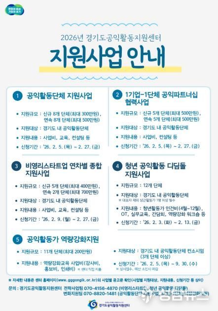 유명화 경기도공익활동지원센터장은 “이번 모집을 통해 공익활동의 현장 기반을 강화하고, 다양한 주체들이 지역사회 문제 해결에 적극 참여하길 기대한다”고 말했다.