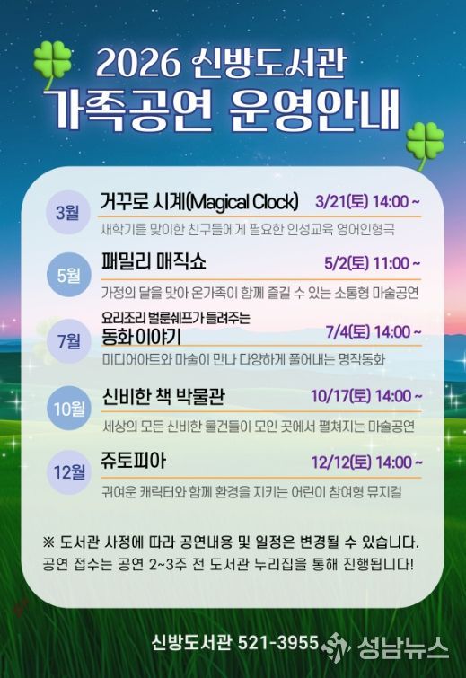 성남뉴스 관리자 기자 | 천안시 신방도서관은 가족특화도서관의 특성을 살려 연중 온 가족이 함께 즐길 수 있는 ‘2026 가족 공연’ 프로그램을 운영한다고 5일 밝혔다.