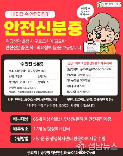 성남뉴스 관리자 기자 | 대전 중구는 위급상황 발생 시 신속한 구호조치를 돕기 위해 의료정보 등을 기재할 수 있는‘안전신분증’을 제작하여 각 동 행정복지센터를 통해 배부한다고 5일 밝혔다.