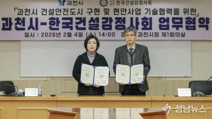 성남뉴스 관리자 기자 | 과천시는 지난 4일 시청 제1회의실에서 신계용 과천시장과 (사)한국건설감정사회 김창근 회장이 참석한 가운데 ‘건설 안전 도시 구현을 위한 기술협력 업무협약’을 체결했다.