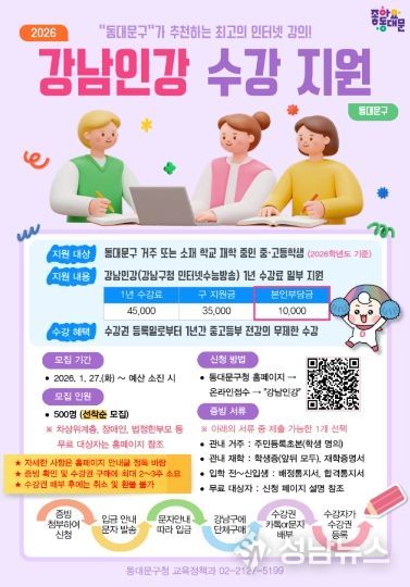 성남뉴스 관리자 기자 | 서울 동대문구는 관내 중·고등학생의 사교육비 부담을 덜고 자기주도 학습 기반을 넓히기 위해 ‘강남인강(강남구청 인터넷수능방송) 수강 지원 사업’을 2026년에도 이어간다고 밝혔다.