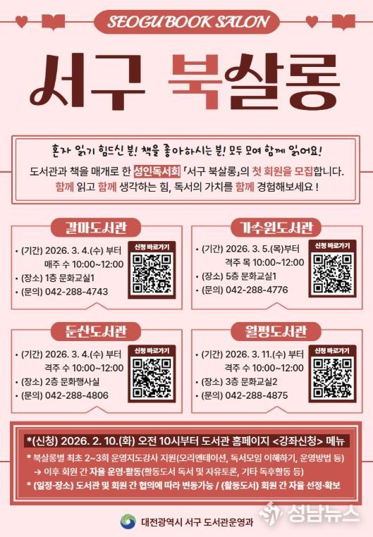 성남뉴스 관리자 기자 | 대전 서구 4개 공공도서관(갈마, 가수원, 둔산, 월평)은 주민들을 대상으로 책과 도서관을 매개로 한 성인 독서회 ‘서구 북살롱’을 운영한다고 5일 전했다.