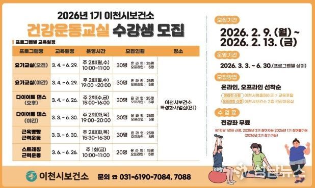 성남뉴스 관리자 기자 | 이천시보건소는 시민들이 건강생활을 실천할 수 있도록 ‘2026년 건강운동교실 1기’ 참여자를 선착순으로 모집한다.