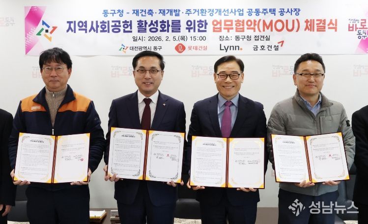 성남뉴스 관리자 기자 | 대전 동구는 5일 관내 대규모 공동주택 공사 현장의 시공사와 ‘지역사회 공헌 활성화 업무협약’을 체결하고, 지역 안전관리 강화와 상생 협력을 위한 협력 체계를 구축했다고 밝혔다.