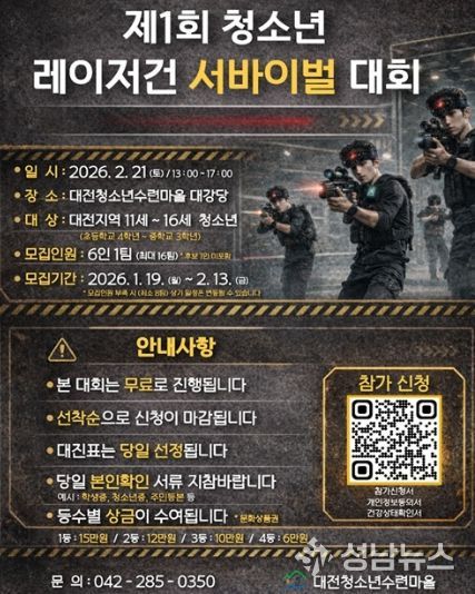 성남뉴스 관리자 기자 | 대전청소년수련마을은 지역 청소년의 건강한 여가문화 조성과 협동심 함양을 위해 ‘제1회 레이저건 서바이벌 대회’를 21일 개최한다.