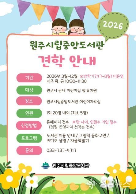 성남뉴스 관리자 기자 | 원주시립중앙도서관은 오는 3월부터 12월까지 관내 유치원과 어린이집을 대상으로 도서관 견학 프로그램을 운영한다.