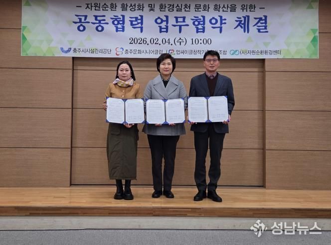 성남뉴스 관리자 기자 | 충주시시설관리공단은 지난 4일 충주문화시니어클럽, 업싸이클&자원순환 환경센터와 함께 자원순환 확대와 ESG 경영 실천을 위한 상호협력 협약을 체결했다고 밝혔다.