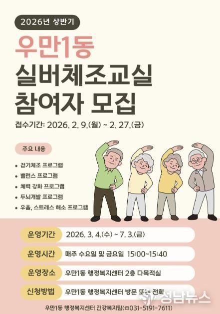 성남뉴스 관리자 기자 | 수원시 팔달구 우만1동은 관내 어르신들의 건강 증진을 위해 2월 9일부터 2월 27일까지 ‘2026년 상반기 실버체조교실’ 참여자를 선착순으로 모집한다고 밝혔다.