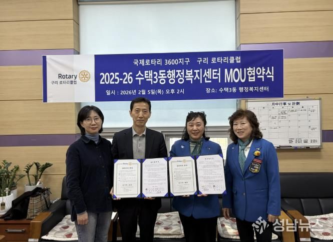 성남뉴스 관리자 기자 | 구리시 수택3동 행정복지센터는 지난 5일, 구리로타리클럽과 지역사회 취약계층의 복지 증진과 나눔 문화 확산을 위한 업무 협약을 체결했다고 밝혔다.