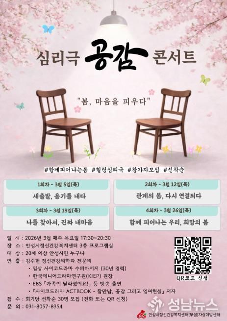 성남뉴스 관리자 기자 | 안성시보건소 안성시정신건강복지센터(부설 자살예방센터)는 시민의 정신건강 증진과 생명존중 문화 조성을 위해 심리극(사이코드라마) 기법을 활용한 체험형 집단 프로그램 '공감' 콘서트를 오는 3월 운영한다고 밝혔다.