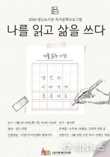 성남뉴스 관리자 기자 | 고양특례시 행신도서관은 일반 성인을 대상으로 하는 글쓰기 프로그램 ‘나를 읽고 삶을 쓰다’를 운영한다.