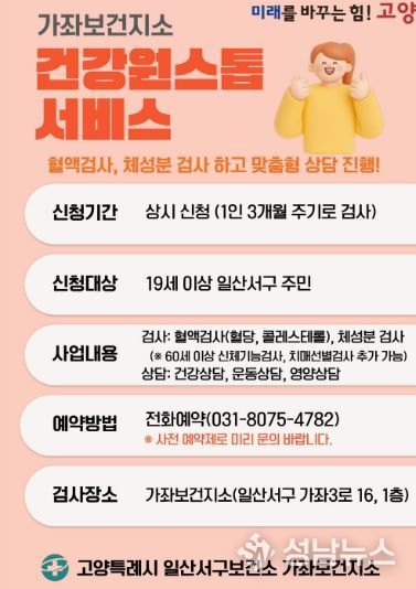 성남뉴스 관리자 기자 | 고양특례시 일산서구보건소 가좌보건지소는 지역 주민들의 만성질환을 조기에 발견하고 체계적인 건강관리를 지원하기 위해 건강원스톱 서비스를 연중 운영한다고 밝혔다.