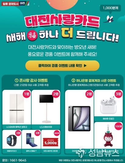 2월 한 달간 대전사랑카드를 25만 원 이상 사용한 고객 중 895명을 추첨해 1등 냉장고, 2등 스탠드형 TV 등 다양한 경품을 제공한다.