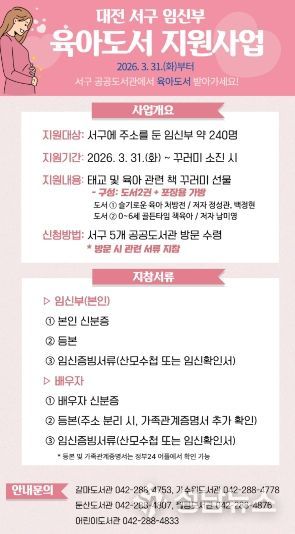 성남뉴스 관리자 기자 | 대전 서구 공공도서관은 3월 31일부터 ‘임신부 육아 도서 지원사업’을 운영한다.