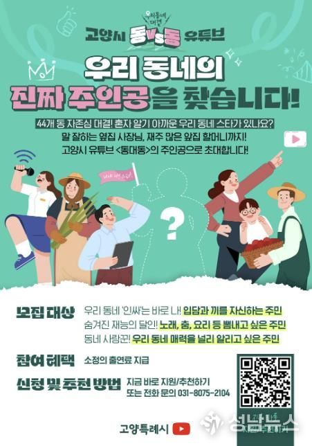 성남뉴스 관리자 기자 | 고양특례시가 44개 동 주민들이 직접 주인공으로 참여하는 신규 유튜브 예능 콘텐츠 ‘동대동(우리 동네 대결)’의 본격적인 제작을 앞두고 ‘우리 동네 대표 선수’를 모집한다고 9일 밝혔다.