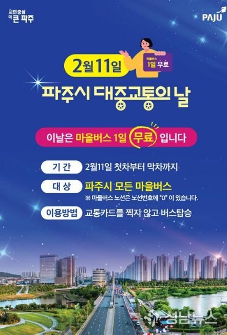 성남뉴스 관리자 기자 | 파주시는 ‘대중교통의 날’을 맞아 대중교통 이용 활성화와 시민 교통비 부담 완화를 위해 오는 2월 11일 하루 동안 파주시 전 지역의 모든 마을버스를 무료로 운행한다.
