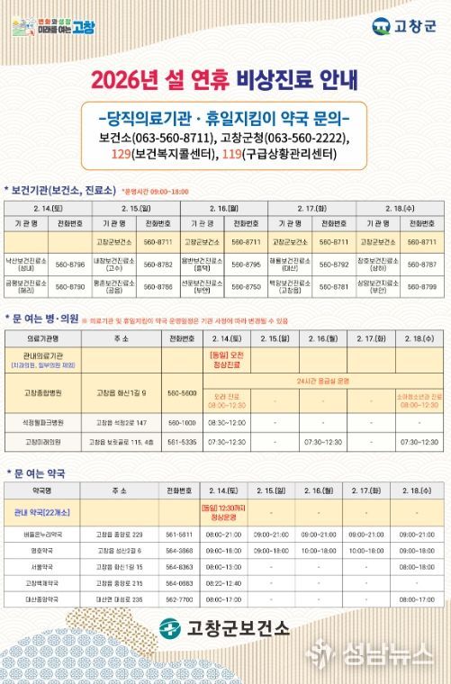 (성남뉴스) 고창군이 설 연휴(14~18일) 군민의 건강을 지키고, 의료 이용 불편을 최소화하기 위해 비상진료체계를 가동한다.