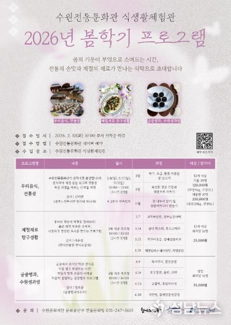 (성남뉴스) 수원문화재단은 오는 10일부터 수원전통문화관 식생활체험관 2026년 봄학기 프로그램 참여자를 모집한다. 이번 봄학기 프로그램은 계절의 변화에 맞춘 전통 식문화와 다양한 음식을 시민들이 쉽고 재미있게 경험할 수 있도록 기획했다. 전통장 담그기부터 제철 식재료 요리, 궁중병과 체험까지 다양한 내용으로 운영한다.