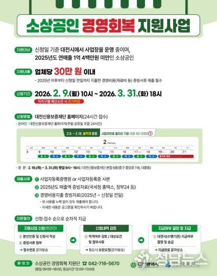 신청 기간은 2월 9일 오전 10시부터 3월 31일 오후 6시까지이며, 대전신용보증재단 홈페이지를 통한 온라인 접수로 진행된다.