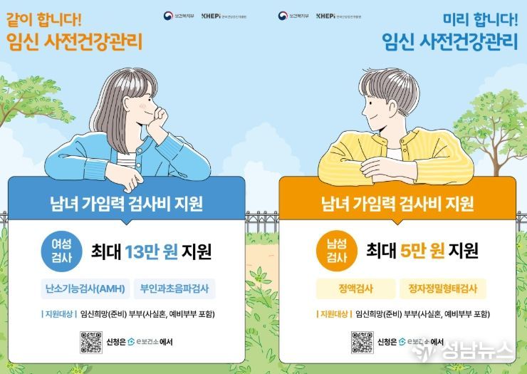지원 항목은 여성의 경우 난소기능검사와 자궁·난소 질환을 확인하는 부인과 초음파 검사이며, 남성은 정자정밀형태 검사이다.