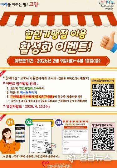 (성남뉴스) 고양시자원봉사센터는 자원봉사자에 대한 예우를 강화하고 지역경제 활성화를 위해 오는 2월 9일부터 4월 10일까지 ‘자원봉사 할인가맹점 이용 활성화 이벤트’를 운영한다고 9일 밝혔다.