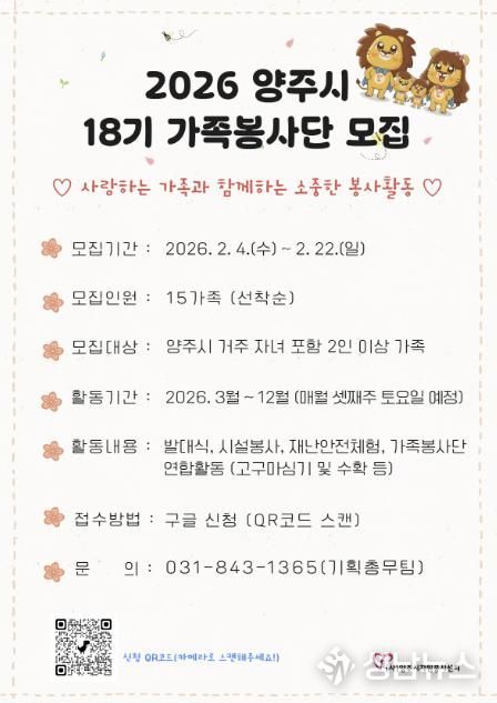 (성남뉴스) 양주시자원봉사센터는 가족이 함께 참여하는 자원봉사 활동을 통해 건강한 가족문화를 조성하고 지역사회 나눔을 실천하기 위해 가족 단위로 함께 참여하는 ‘18기 가족봉사단’을 모집한다고 밝혔다.