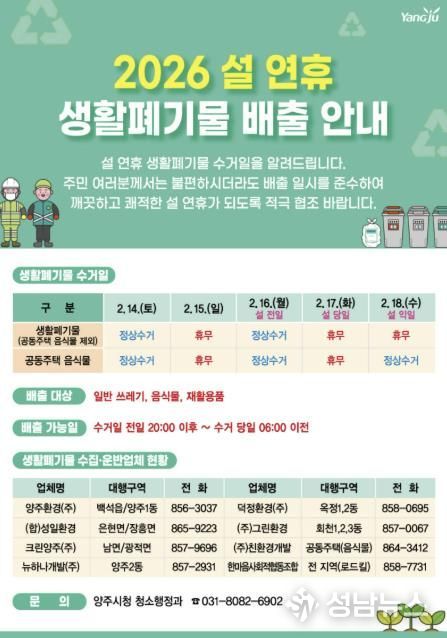 (성남뉴스) 양주시가 설 연휴 기간 시민과 방문객의 불편을 줄이기 위해 ‘2026년 설 연휴 생활폐기물 관리 대책’을 추진한다.