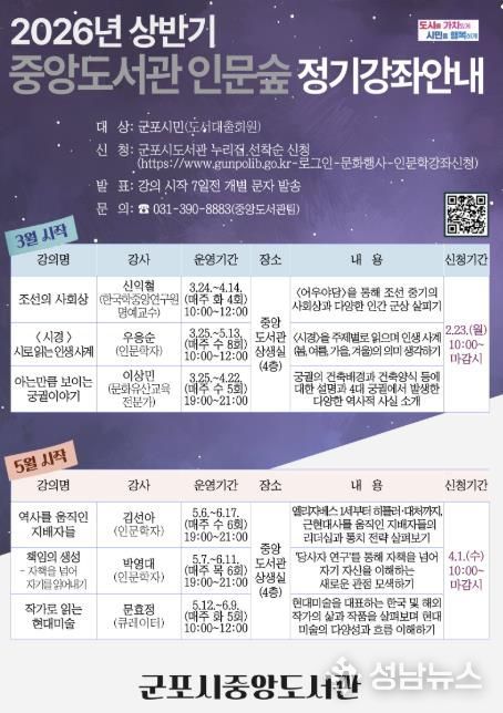 (성남뉴스) 군포시중앙도서관은 시민의 인문학적 소양을 함양하고 공동체적 성찰의 기회를 확대하고자 ‘중앙도서관 인문숲’ 상반기 강좌를 운영한다.