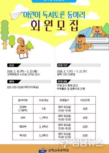 어린이 독서토론 동아리는 꼬마북(7세, 그림책), 새싹(1·2학년), 해피북(3·4학년), 책사랑(5·6학년) 총 4개 동아리로 구성해 매주 토요일 운영하며, 회원모집은 2월 10일부터 2월 23일까지 삼척교육문화관 누리집에서 선착순 접수로 진행된다.
