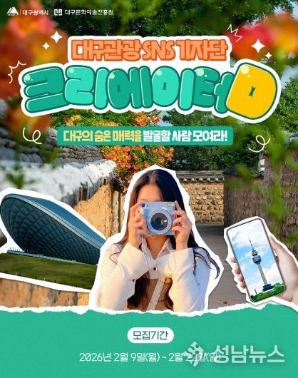 (성남뉴스) 대구광역시와 대구문화예술진흥원은 대구 관광의 매력을 발굴하고, 확산할 대구관광 크리에이터D를 다가오는 22일까지 모집한다.