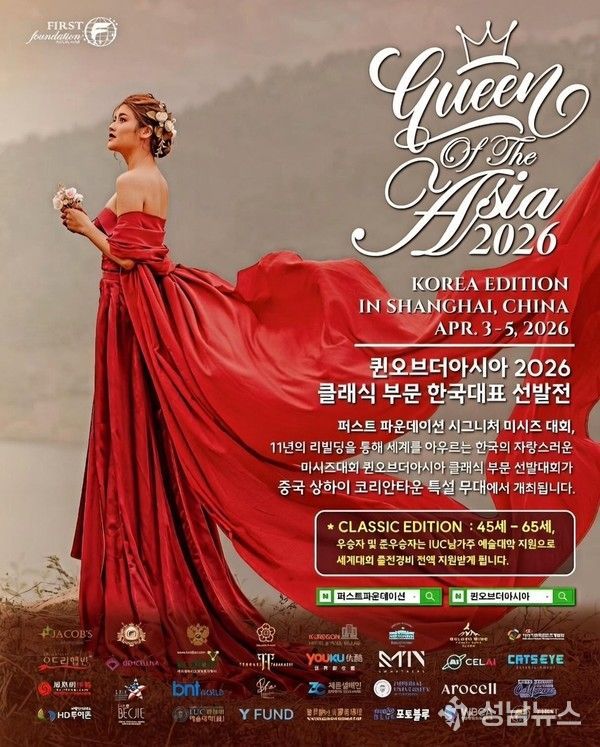 (성남뉴스) 비영리문화예술단체 퍼스트파운데이션이 주관하는 시그니처 미시즈 대회 ‘미시즈 퍼스트 퀸오브더아시아(Queen of the Asia)’ 2026 정규 에디션이 한국 예심을 거쳐 필리핀과 중국에서 이원화된 본선을 진행할 예정인 가운데, 대회의 개최 취지와 방향성에 대한 관심이 높아지고 있다.