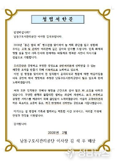(성남뉴스) 인천시 남동구 도시관리공단은 청렴 문화 정착을 위해 공사, 용역, 물품 관련 업체와 전 직원에게 ‘청렴 서한문’을 발송했다고 11일 전했다.