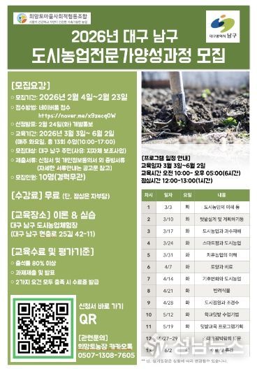 (성남뉴스) 대구 남구는 도시농업에 대한 전문적인 지식을 전달하고 현장 실무 역량을 갖춘 인력을 양성하기 위해 ‘2026년 도시농업전문가 양성과정’ 수강생을 모집한다고 밝혔다. 이번 과정은 도심 속 농업의 가치를 확산시키고 구민들에게 새로운 직업 역량 강화 및 사회 참여의 기회를 제공하기 위해 기획됐다.