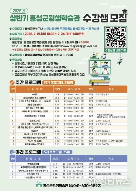 (성남뉴스) 우수 평생학습도시 홍성군이 유아부터 노년까지 전 생애를 아우르는 학습 기회를 제공하기 위해 오는 19일부터 24일까지 6일간 홍성군평생학습관과 신도시평생학습관에서 상반기 프로그램 수강생을 모집한다.