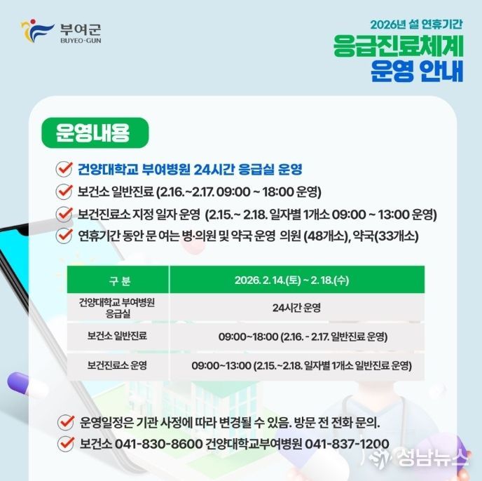 (성남뉴스) 부여군은 다가오는 설 연휴 기간(2월 14일~ 2월 18일) 동안 군민의 의료 공백을 최소화하고 응급상황에 신속하게 대응하기 위해 연휴 응급진료체계를 가동한다고 밝혔다.