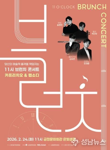 (성남뉴스) 부산 금정구 금정문화회관 은빛샘홀에서 펼쳐질 2026년 2월 브런치 콘서트는 ‘카프리치오 & 랩소디’란 특별한 주제로 관객들을 찾아온다.
