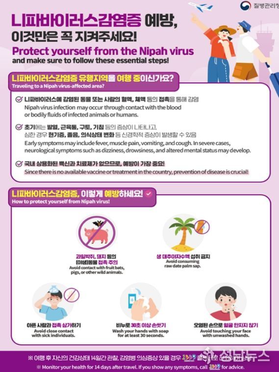 (성남뉴스) 서산시는 올해 인도 서벵골주에서 니파바이러스 환자 2명 발생, 방글라데시아에서 사망사례가 보고됨에 따라 발생 국가 방문 시 예방 수칙 준수를 당부했다.