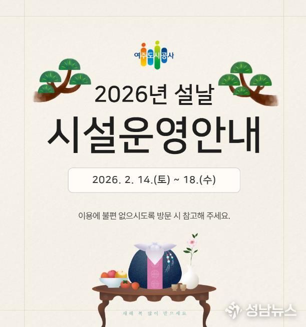 (성남뉴스) 여주도시공사가 다가오는 2026년 설 연휴를 맞아 시민과 귀성객들이 안전하고 편안한 명절을 보낼 수 있도록 주요 시설 운영시간 조정 및 특별 서비스를 시행한다고 밝혔다.