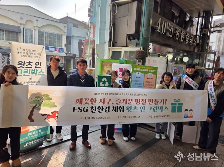 (성남뉴스) 인천중구시설관리공단은 공단 임직원들이 설을 앞두고 지난 11일 신포국제시장에서 지역 주민들을 대상으로 생활 속 올바른 분리배출 실천을 유도하기 위한 체험형 친환경 행사 ‘왓츠 인 그린박스’를 진행했다고 밝혔다.